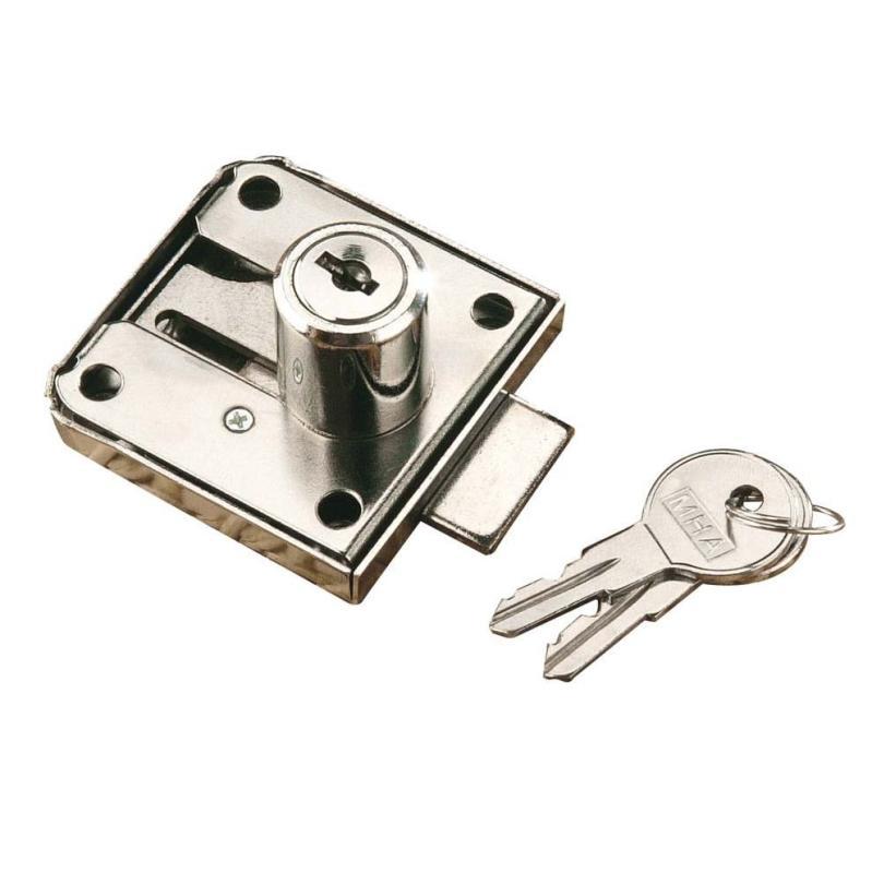 Közel 60 mm méretű rászegzős, krómozott fiókzár, melynek a cilindere elcsúsztatható, 20-45 mm között állítható. Ezáltal többféle fiókzár cseréjére alkalmas. Egyforma zárlatú zárak, a kulcsok kombinációja azonos.